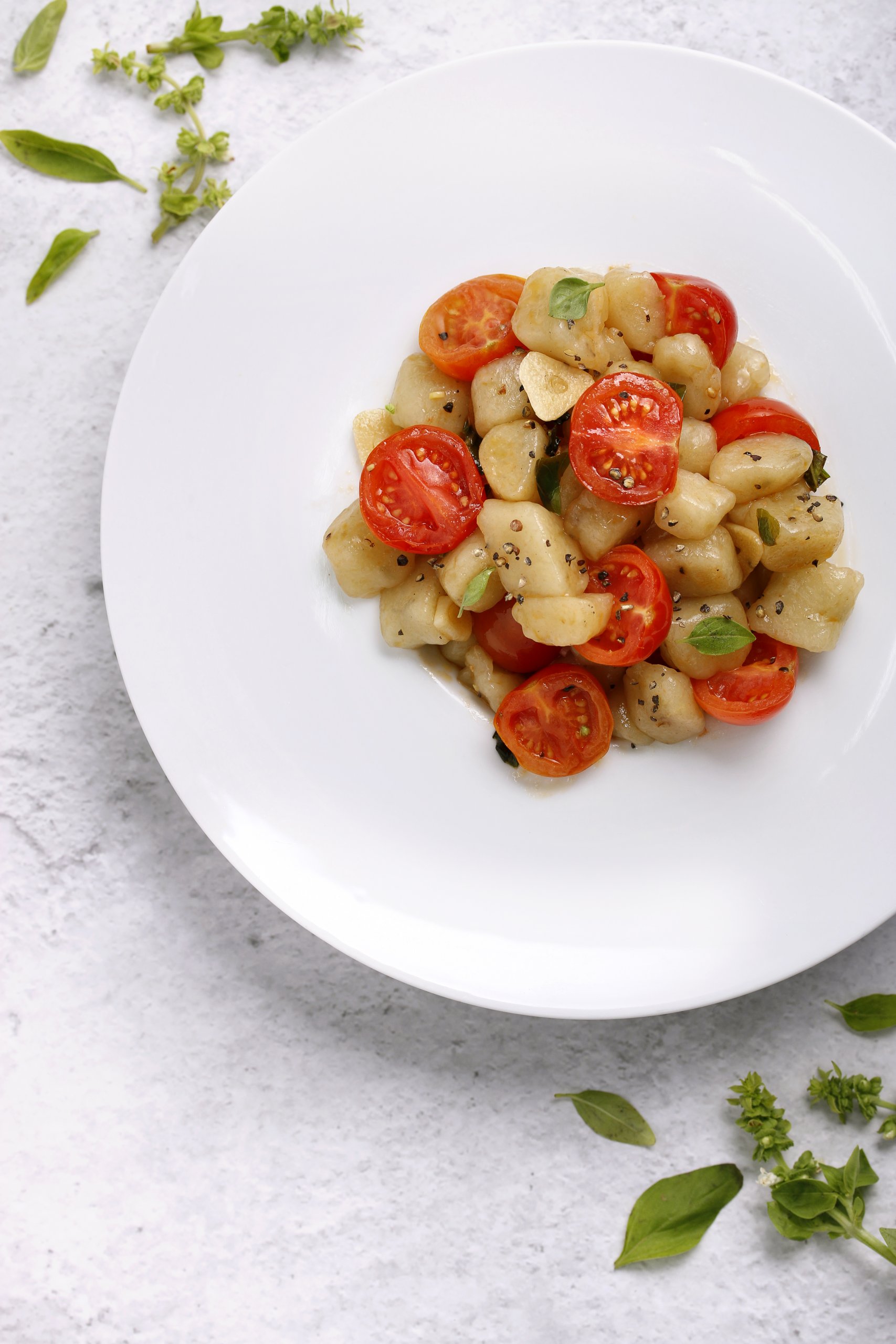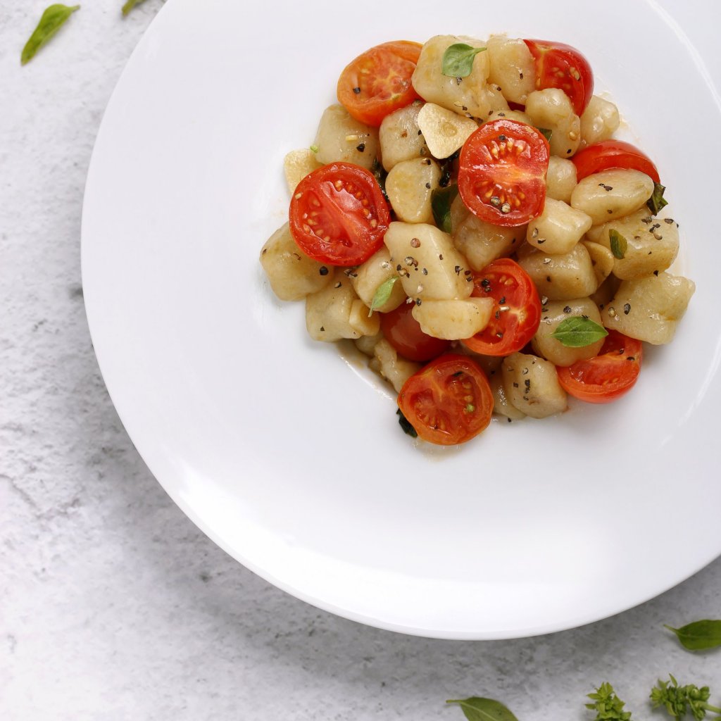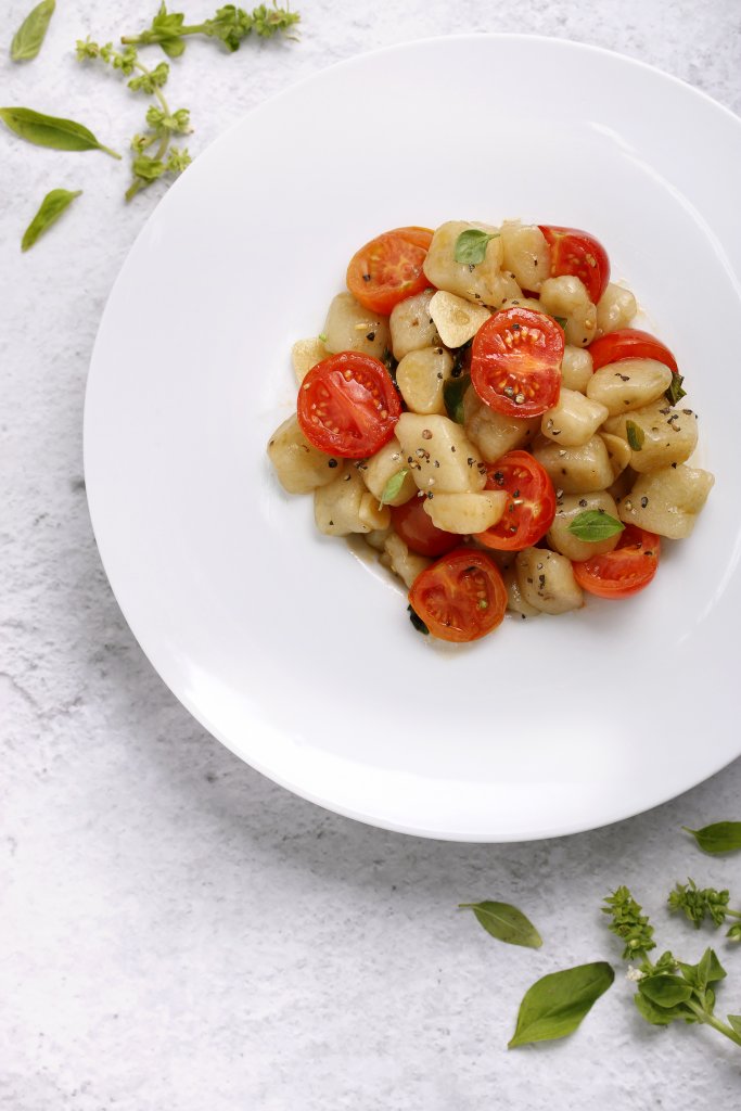 5. מחממים שמן במחבת, מוסיפים את השום ומקפיצים קלות. מוסיפים עגבניות שרי ומקפיצים עוד כדקה. מוסיפים את הניוקי המסונן ומקפיצים הכל יחד, מוסיפים מלח פלפל ובזיליקום, מערבבים ומקפיצים יחד עוד כדקה. מתקנים תיבול ומגישים מיד.