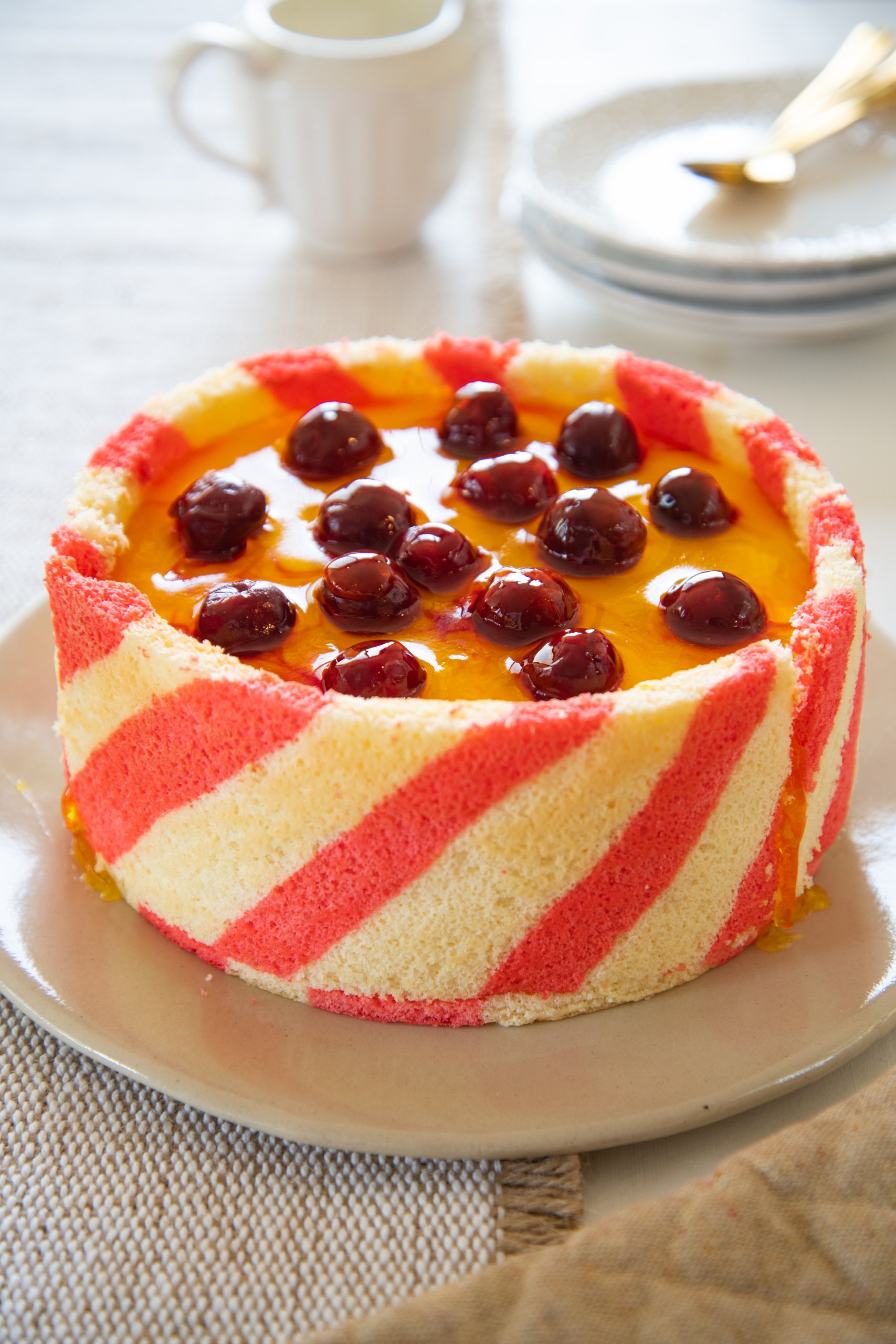 מרפדים את דופן התבנית בשקף גבוה ומניחים את רצועות העוגה סביב הבסיס על דופן