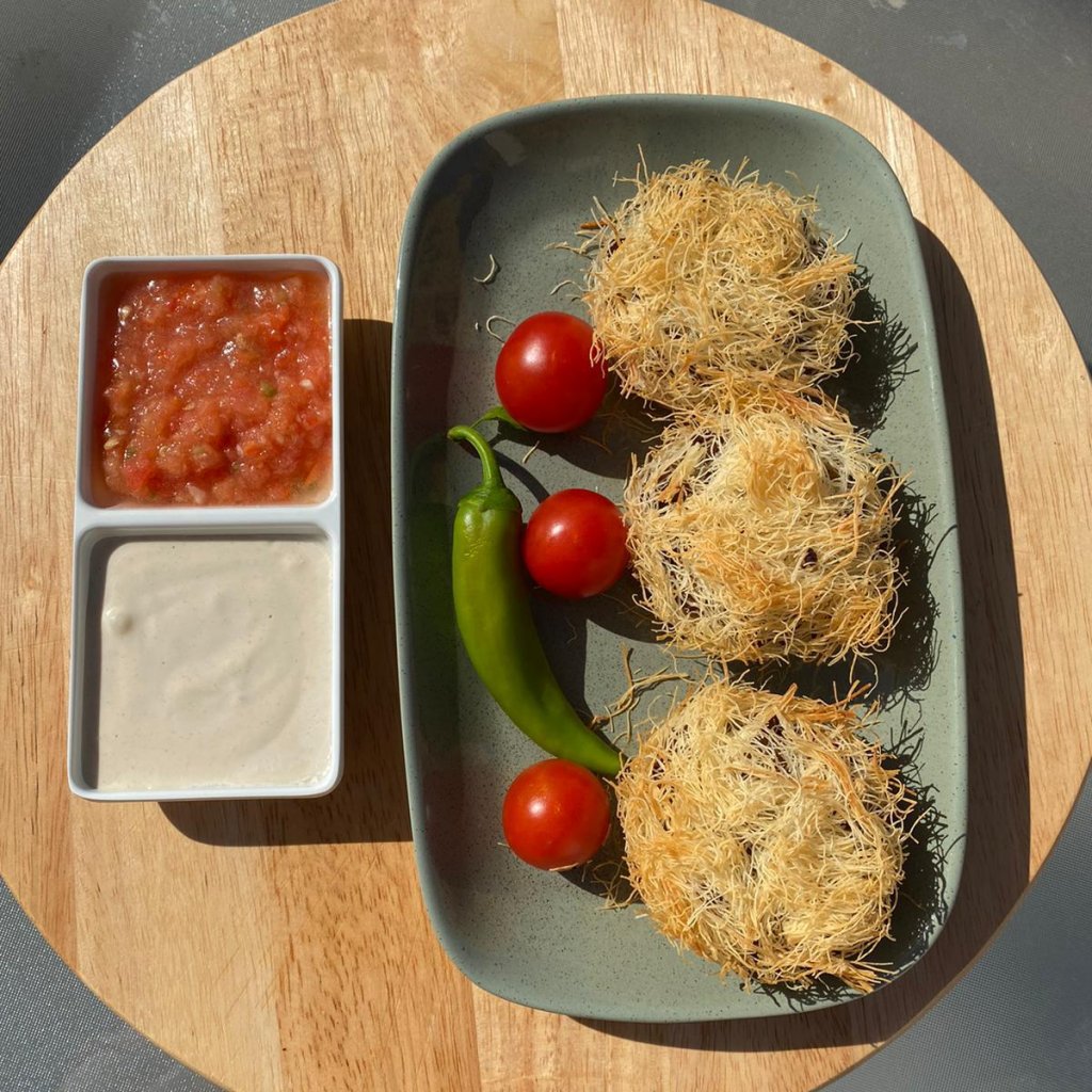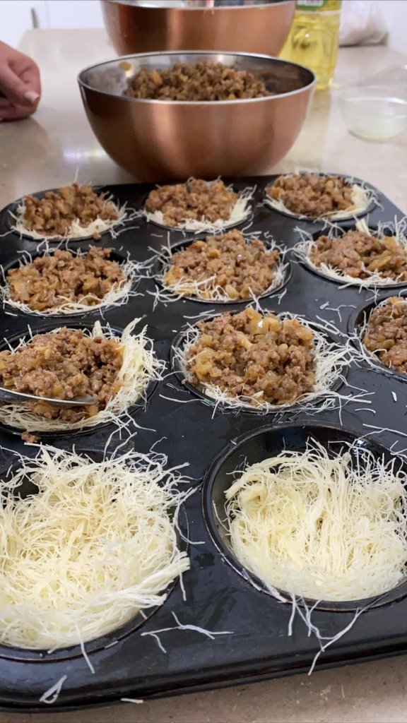 -מפזרים את תערובת הבשר על הקדאיף בשכבה אחידה ומכסים בשערות הקדאיף שנותרו (בשכבה אחידה גם הפעם). מכניסים לתנור ל-25 דקות. אם השערות לא זהובות, משאירים בתנור לדקה-שתיים נוספות של אפייה.