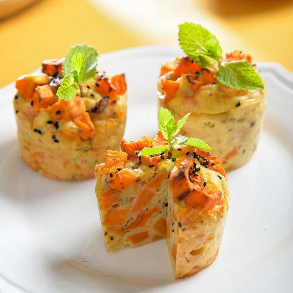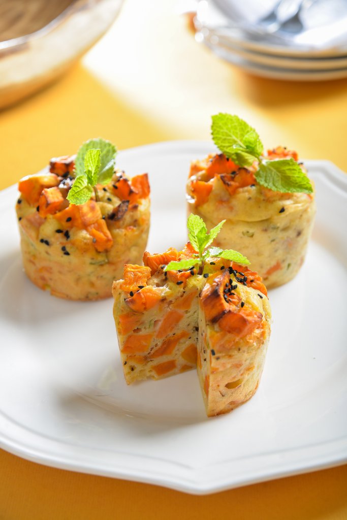 יוצקים לתבניות אישיות או לתבנית גדולה . מפזרים מלמעלה את קוביות הבטטה הנותרות את הגבינה המגוררת והקצח.