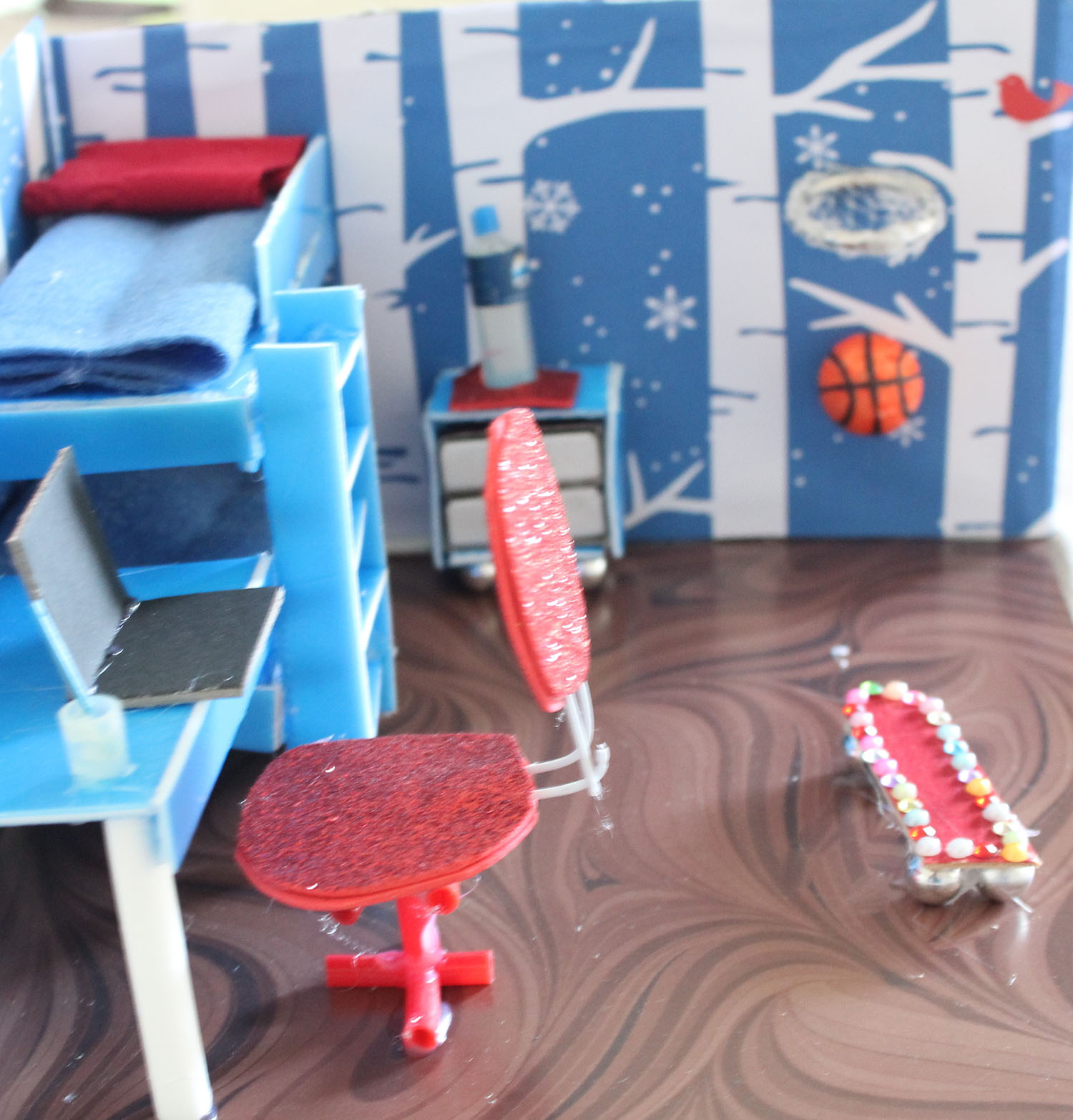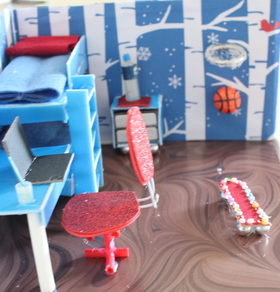 השולחן :גוזרים מלבן 8 על 4 ס"מ מהקרטון. מוסיפים לו מסגרת כמו שעשינו למיטות ומדביקים את השולחן ליד המיטה משמאל.