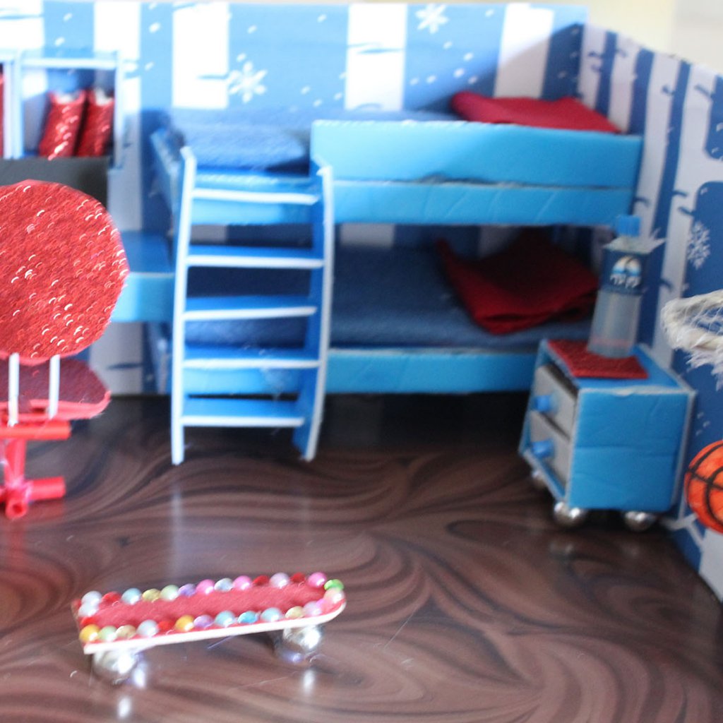 שמיכות:גוזרים בד באורך 8 על 12 ס"מ מקפלים ומדביקים מקופל על המיטה התחתונה. מכינים עוד שמיכה למיטה העליונה.