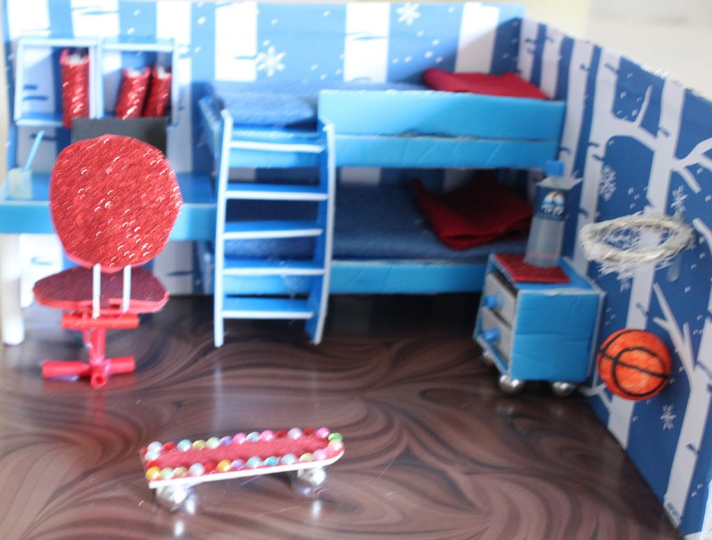 סולם: מודדים את גובה המיטה העליונה מהרצפה וגוזרים 2 רצועות באורך הזה על ס"מ אחד רוחב אלו יהיו עמודי הסולם.גוזרים 5 מדרגות באורך 3 על 1 ס"מ ומדביקים אותם לעמודי הסולם.