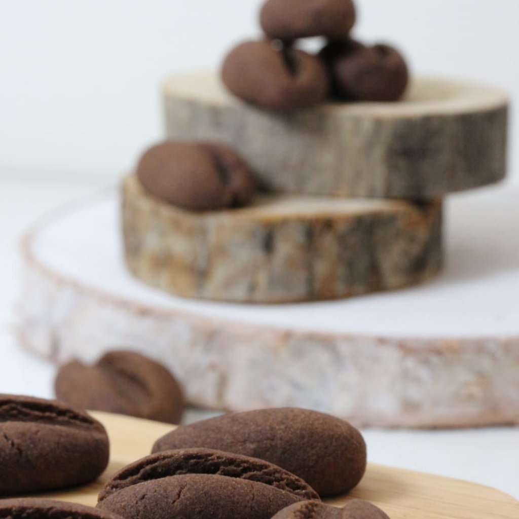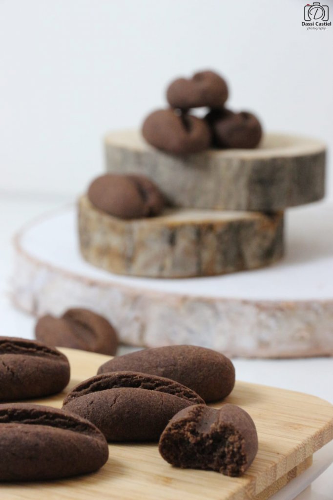 מניחים קיסם עץ או עיפרון לכיוון האורך של כל עוגייה, ולוחצים עד להטבעת פס כך שהיא תראה כמו "פולי קפה". להכניס להקפאה לכחצי שעה.
