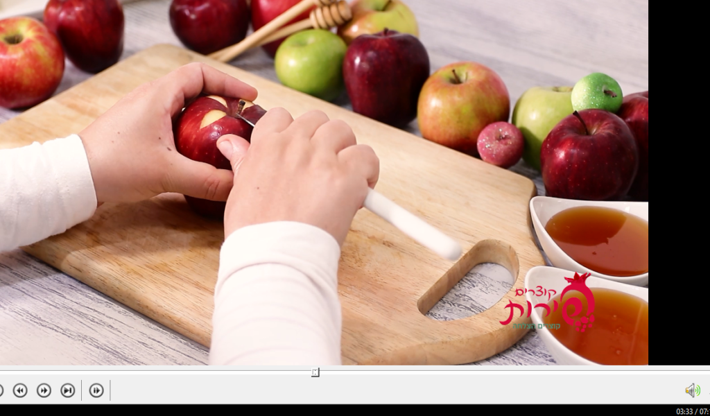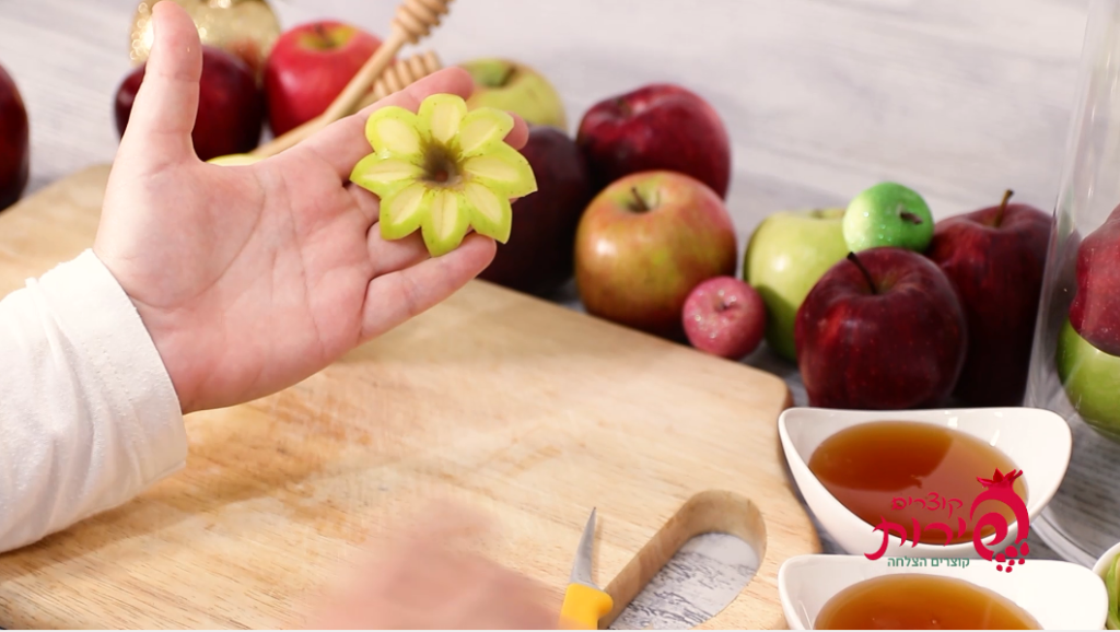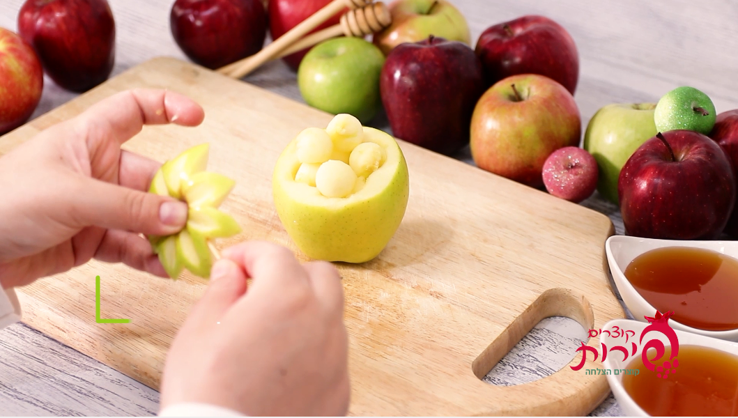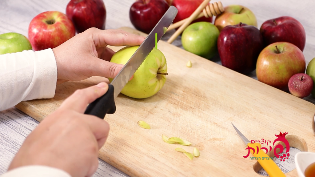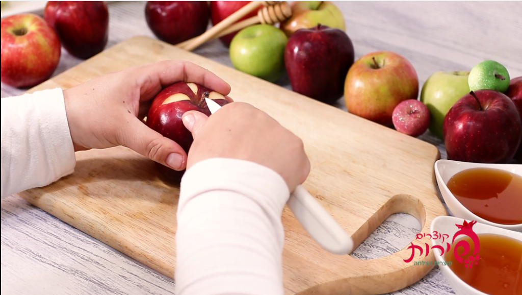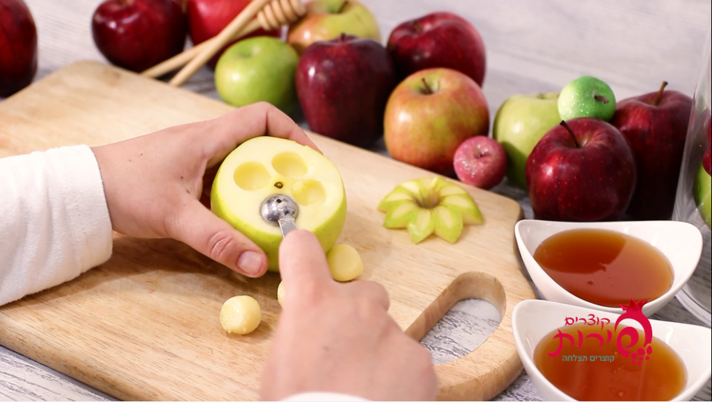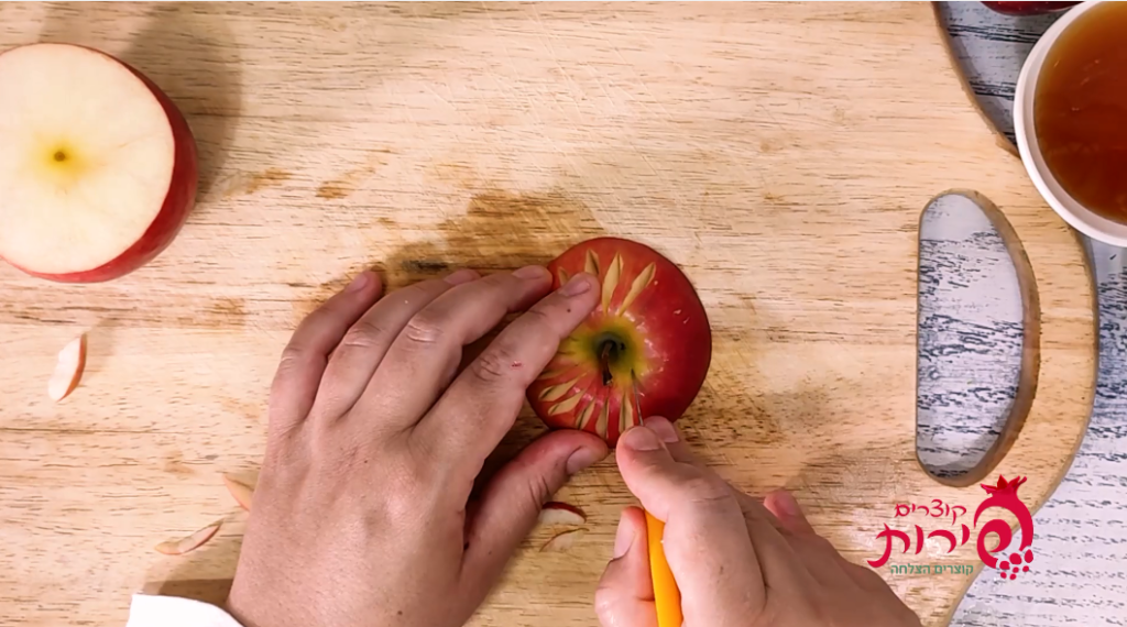 עם סכין ארוכה תורידי את כל החלק העליון עם הפרח. ובגלל שעדיין לא קנית כף פרזיינט – פרגנתי לך רעיון אחר.. עם סכין מטבח – תוציאי את הפנים של התפוח (ותכניסי לשייק או לגרבר.. שלא נעשה בל תשחית ערב ר"ה..) ויש לך קערה מוכנה לדבש!!! אל תשכחי לשים את המכסה היפה שהכנת…