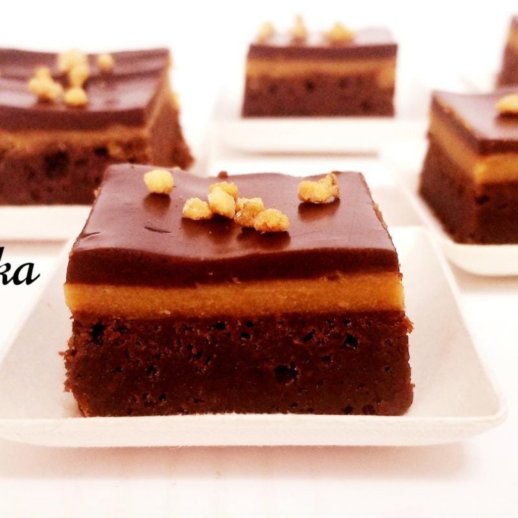יוצקים את ציפוי השוקולד על גבי קרם חמאת הבוטנים ומצננים במקפיא כשעה עד ליציבות.