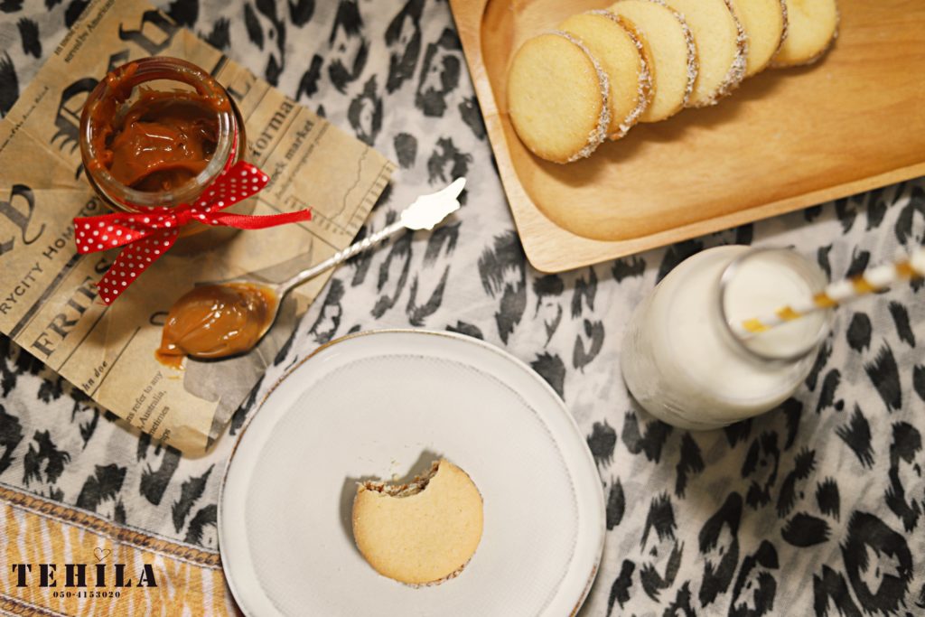 ממלאים שקית זילוף בריבת חלב, מזלפים במרכז כל עוגיה תלולית קטנה ומניחים מעליה עוגיה נוספת בתנועת סיבוב.