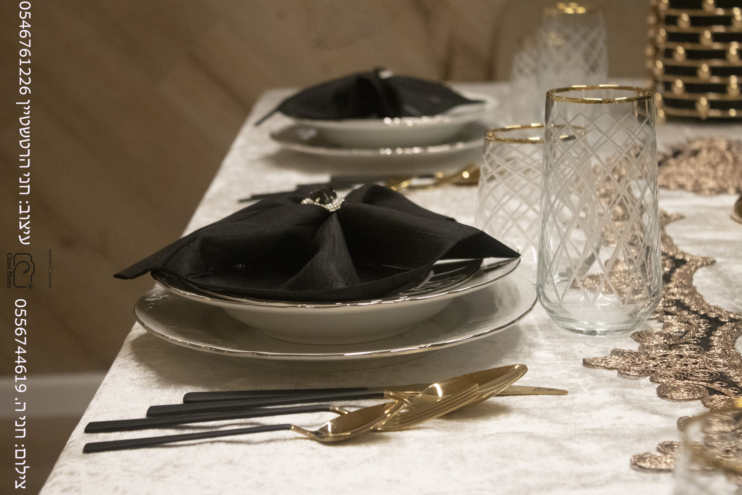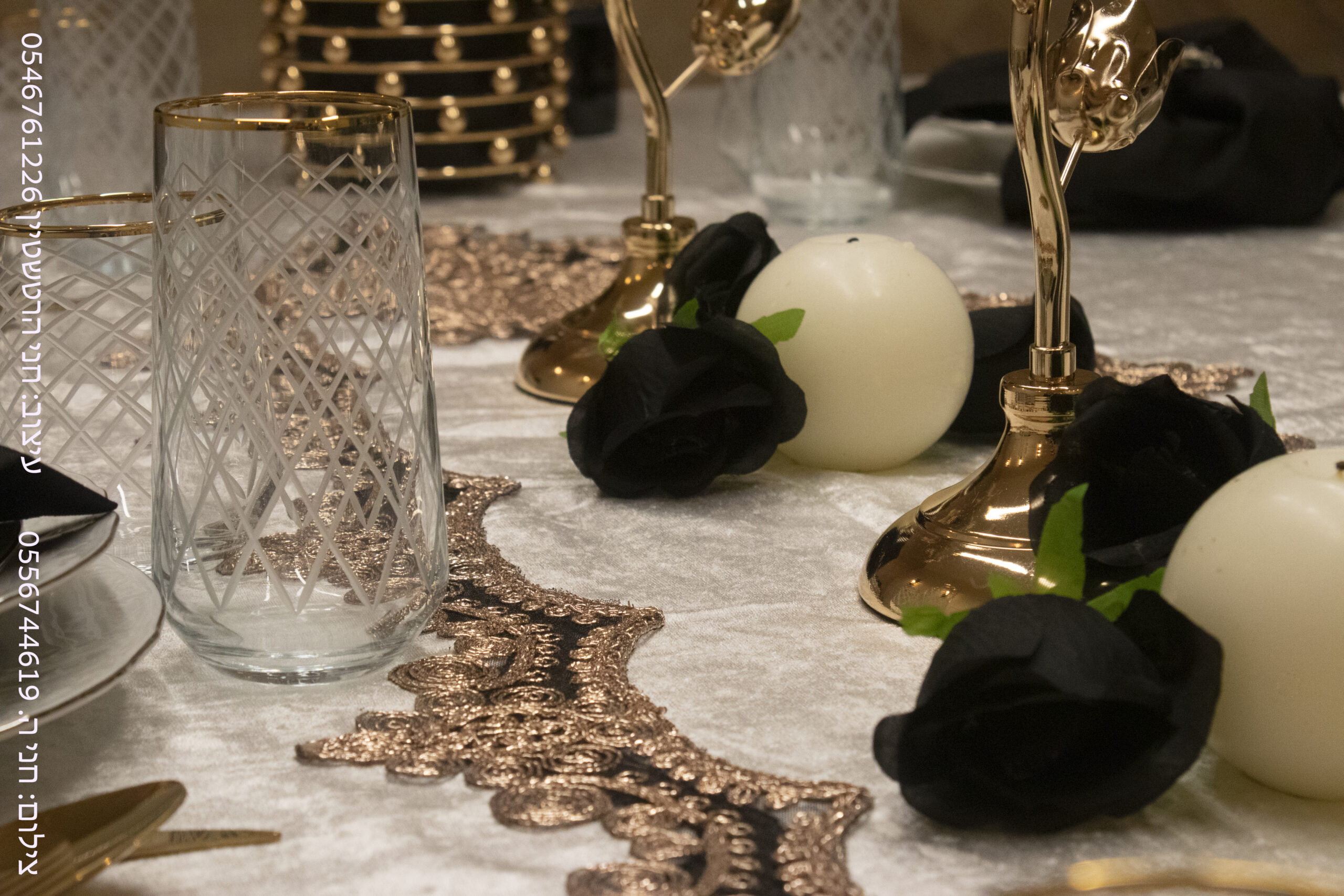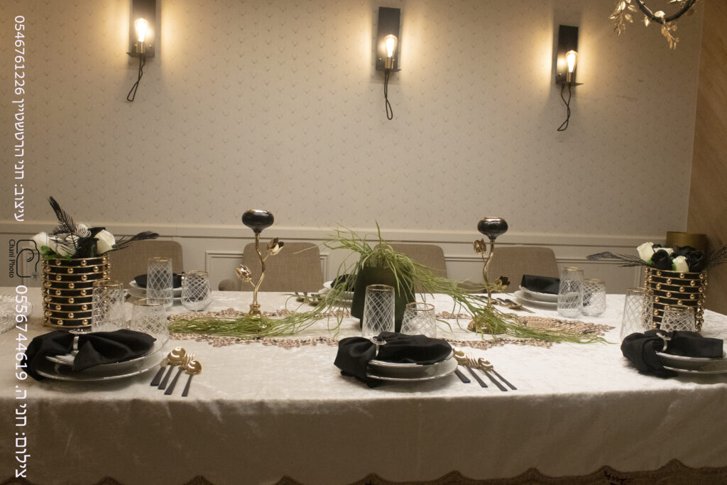 גם בשולחן מעוצב בחג צריך אפיון של החג , חג שמחת תורה הוא גוון זהב ותנו כבוד לתורה , מפת קטיפה מפוארת עם תחרה בגוון ברונזה זהב מבית סראי בשילוב הרבה פרחים כי היא יקרה מפנינים , שילבנו צלחות וכוסות בסדר מוקפד גם צלחת מרק , כי לחג לגוון את כל סעודות הרבה מכינים מרק.