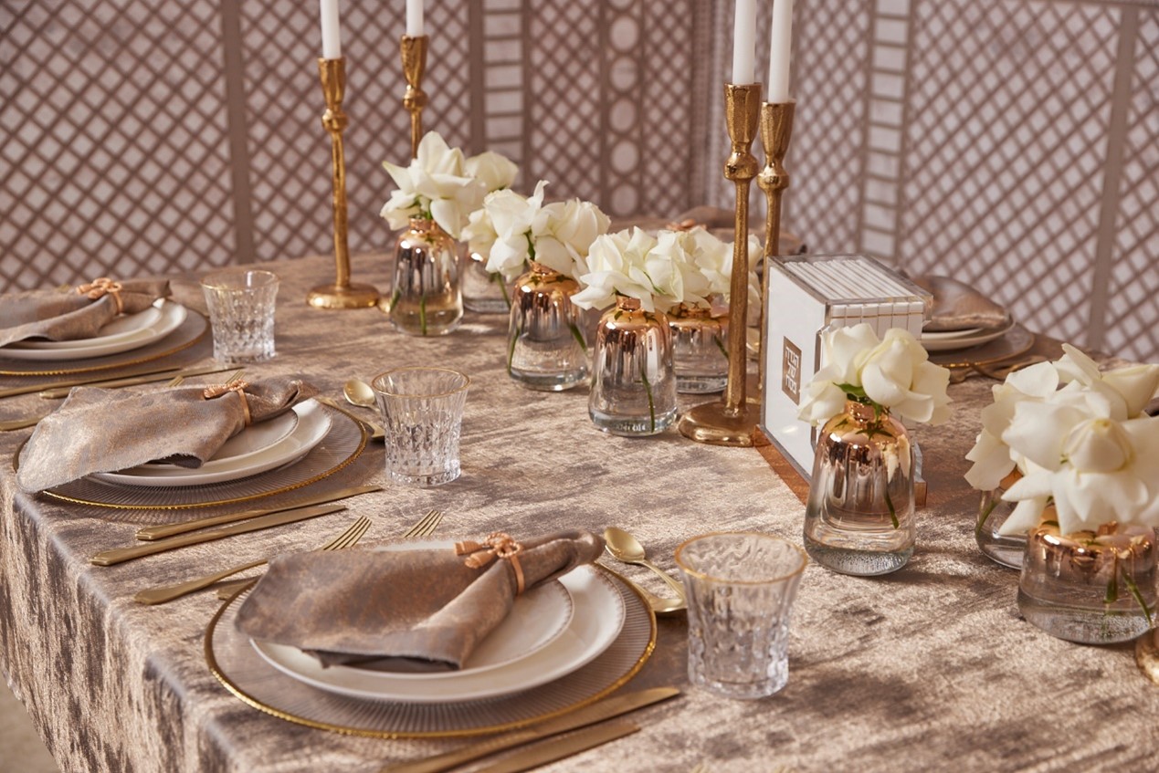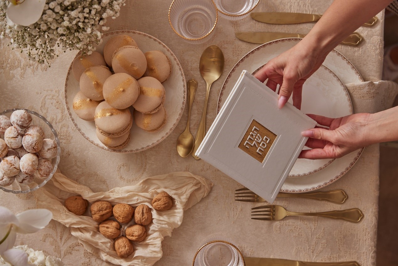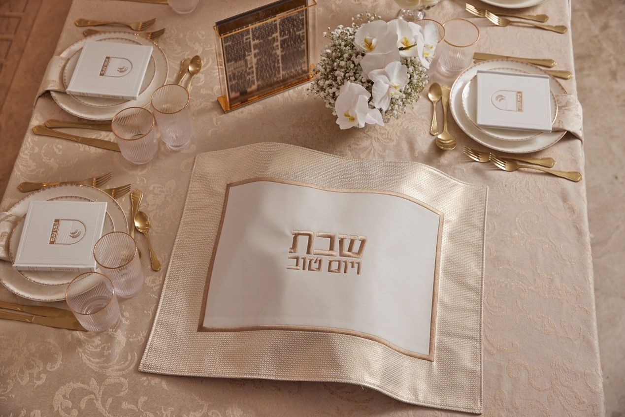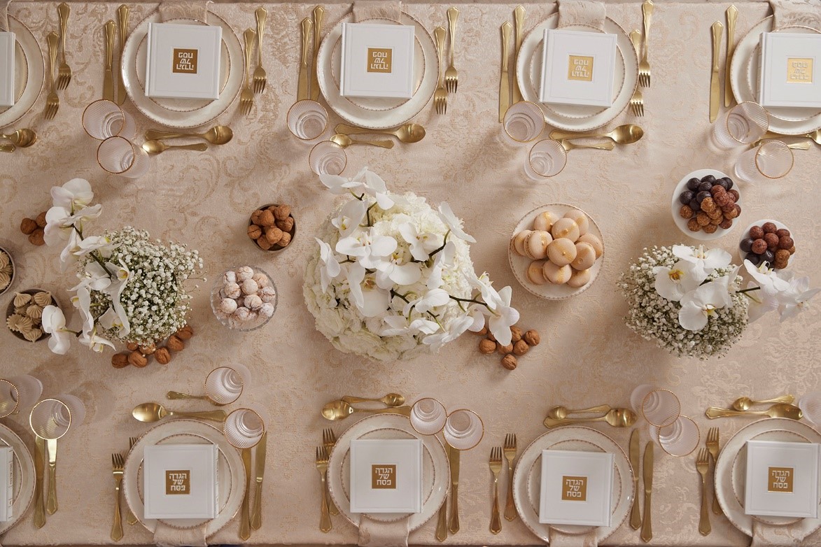 כדי להשלים את המראה הפסחי החגיגי, השתמשו בטקסטיל בצבע לבן, שנהב וזהב, עם עיטורים המתכתבים עם מראה סידורי הפרחים שעל השולחן. ברכות והגדות עם גימור מוזהב, לצד כוסות במראה יוקרתי, מסייעים להדק את האמירה הסגנונית.