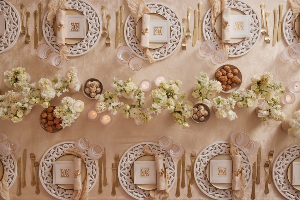 כדי להשלים את המראה הפסחי החגיגי, השתמשו בטקסטיל בצבע לבן, שנהב וזהב, עם עיטורים המתכתבים עם מראה סידורי הפרחים שעל השולחן. ברכות והגדות עם גימור מוזהב, לצד כוסות במראה יוקרתי, מסייעים להדק את האמירה הסגנונית.