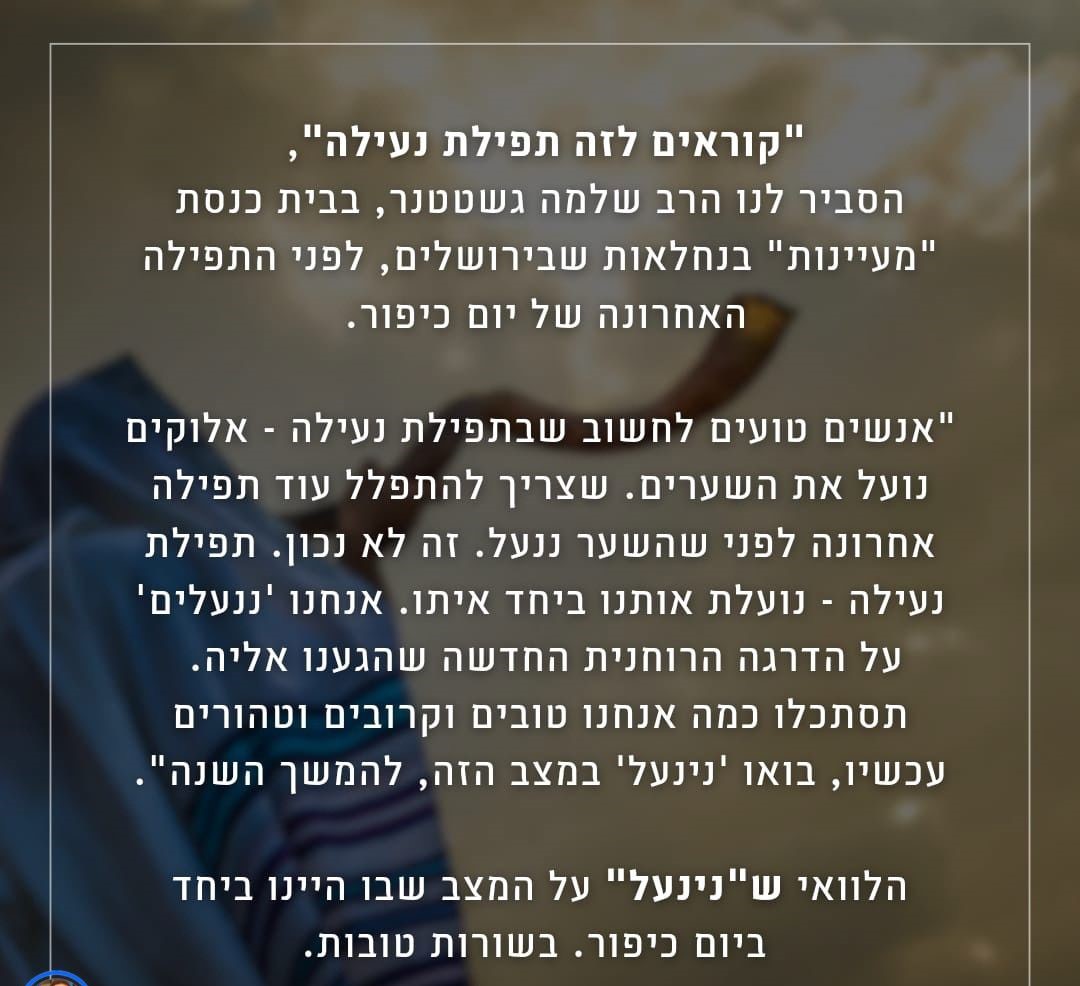 • ויש עוד אינספור סיפורים שנשלחו אליי – מבסיסים צבאיים, מבתי כנסת בעולם שהיו מלאים במיוחד, מבתי ספר ברחבי הארץ שהופכים ביום כיפור לבתי כנסת, ובסוף, אחרי כל זה – לא צריך "סיפור" מיוחד, יום כיפור עצמו הוא הסיפור. לכן אני רוצה לצטט דווקא נערה מירושלים, שהגיעה לתפילות לראשונה, אחרי השנה שעברנו, וסיכמה כך: "כשאומרים 'ביחד ננצח' – תמיד חשבתי שזה אנחנו, ביחד, אחד עם השני. זה חשוב, אבל ביחד ננצח – זה גם ביחד עם המסורת, ביחד עם אלוקים. ביחד איתו ננצח".