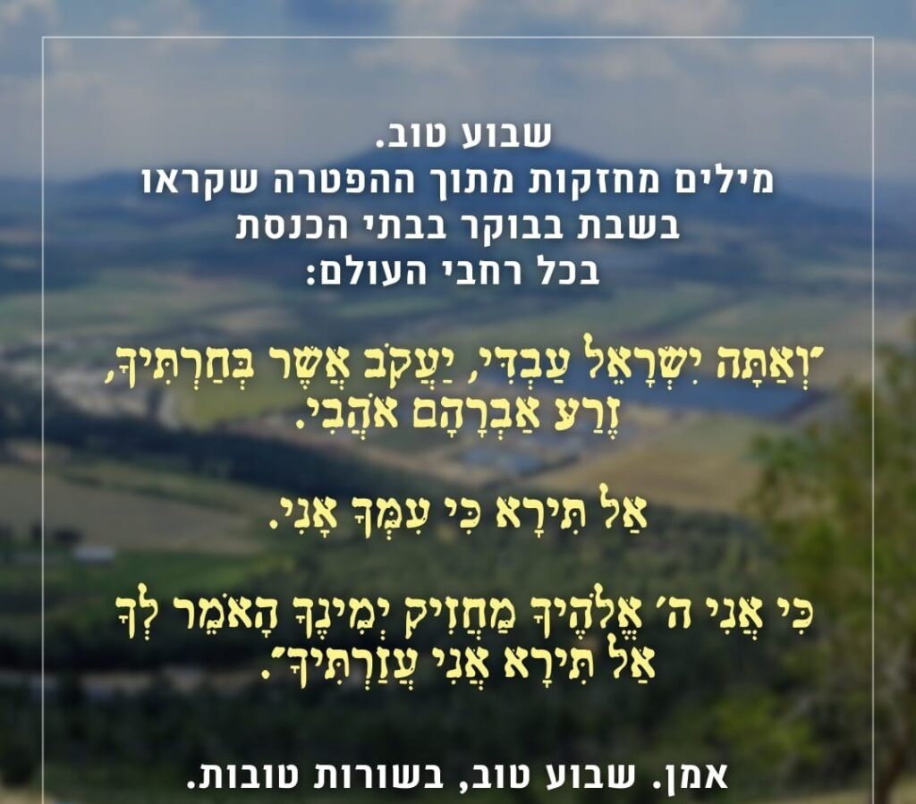 היה מדהים לראות כיצד השבת עצמה מחזקת ומרפאת. בלי עדכוני חדשות, ההתכנסות הזו הייתה החדשות האמיתיות ביותר. כל פסוק מפרשת השבוע, כל מילה משירי השבת, ממש נתנו כוח. (וזה פלא גדול שהשיר "עוד יותר טוב ועוד יותר טוב" הפך ללהיט ששרים ורוקדים שוב ושוב, אפילו בשבת כזו…).