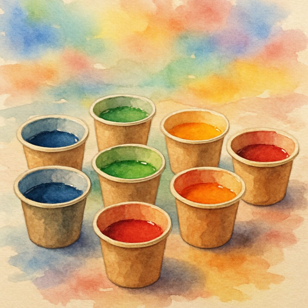 מחלקים לכוסות, מטפטפים צבע מאכל (צבע מאכל פשוט מהסופר, בבקשה אל תשמשו בצבעים איכותיים כדי שהבית ישאר שפוי)
