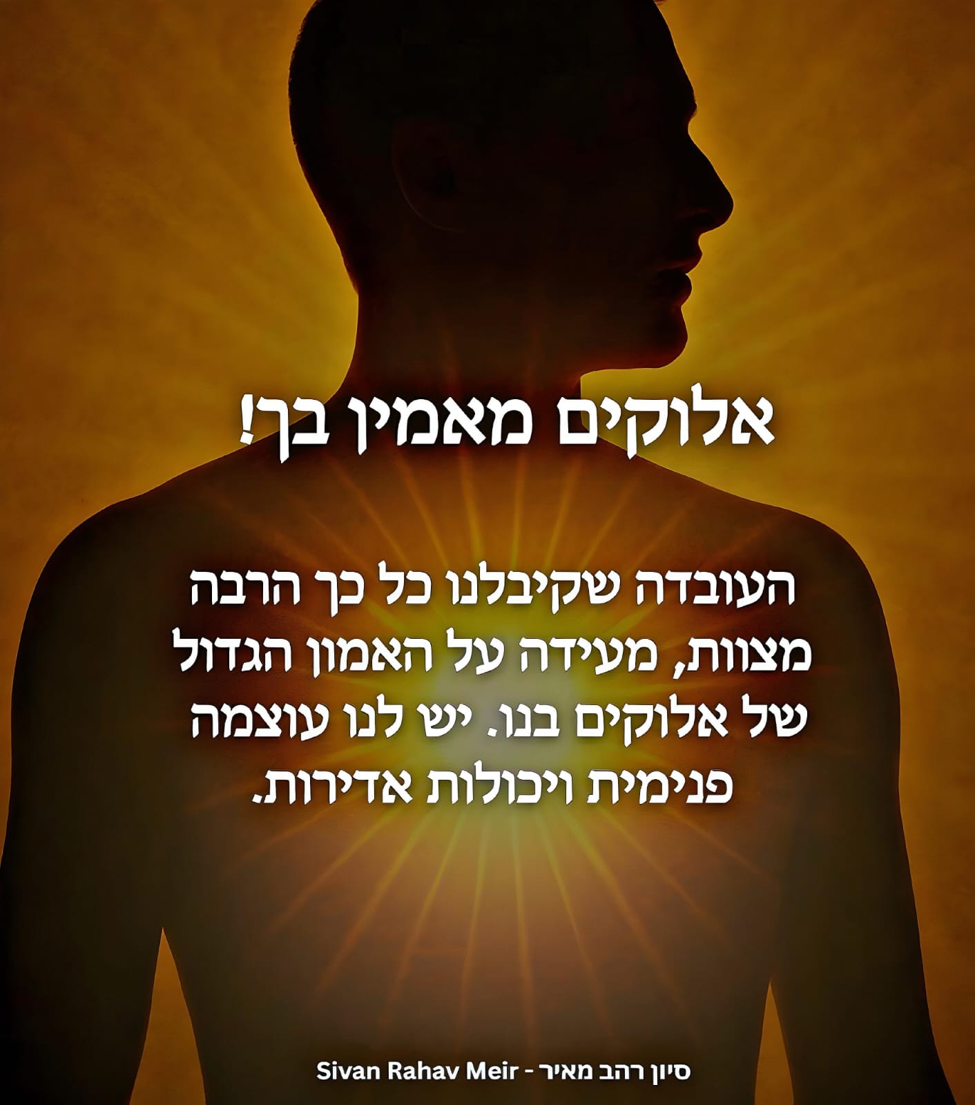 במפעל גדול, דווקא העובד המוכשר והחרוץ יקבל מהבוס יותר תחומי אחריות. אם אלוקים נתן לנו כל כך הרבה אתגרים והלכות – זה כיוון שהוא מכיר אותנו ויודע שאנחנו מסוגלים למלא אותם. יש לנו עוצמה פנימית ויכולות אדירות, שמותאמות לתפקיד הגדול שלנו בבריאה.