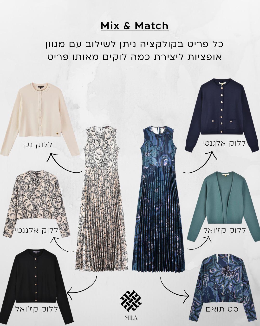 הרעיון המרכזי של הקולקציה הוא שכל פריט הוא לא "בן-יחיד" אלא חלק ממכלול שלם, המתוכנן בקפידה כדי לדבר עם שאר הפריטים. המעצבות של MILA יצרו חיבורים חכמים, הן מבחינת צבעי הבגדים והן מבחינת הדפסים, כך שתוכלי להרכיב לוקים בהרמוניה מושלמת. לדוגמה, סרפן מדוגם עם טופ תואם, חולצת גולף בייסיק מתחתיו, או קרדיגן אלגנטי מעל – כל שילוב יוצר לוק מושלם ושונה לחלוטין מבחינת סגנון ומטרה. כל שילוב הוא סיפור חדש, המאפשר ביטוי אישי וייחודי.
