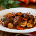 - מוסיפים מעט שמן ומבשלים כשעה וחצי-שעתיים עד לריכוך ובישול מלא, בחצי שעה האחרונה מוסיפים את הפטריות ומוסיפים תיבול ומים אם יש צורך.