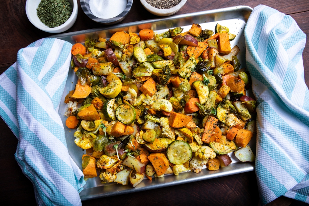- את כל חומרי התיבול מערבבים בקערה קטנה היטב ומפזרים על כל הירקות שבתבנית.