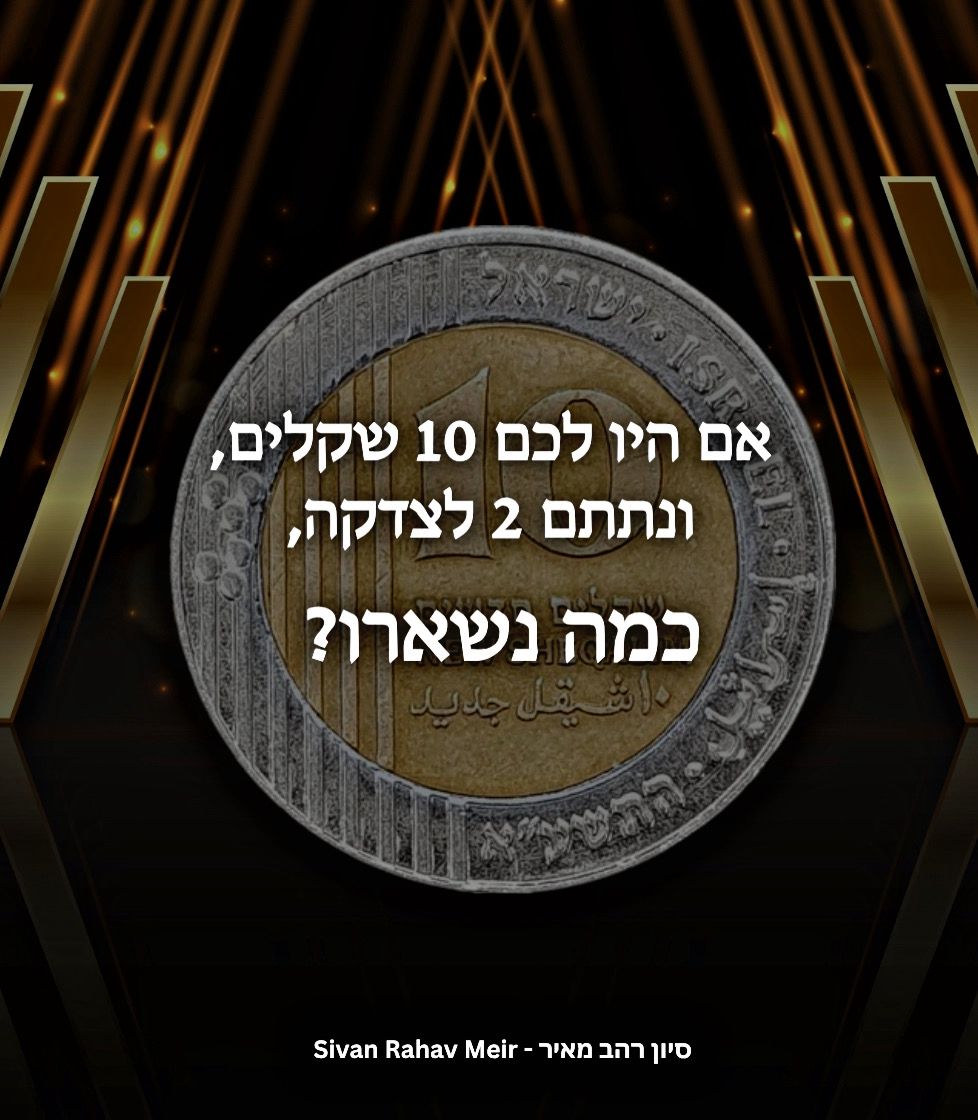 הייתי השבוע בניחום אבלים בביתה של הרבנית צילי שניידר, מייסדת ארגון "קשר יהודי". היא סיפרה שבילדותה, אימא שלה נהגה לשאול אותה: "צילי, אם יש לך עשרה שקלים, ונתת שניים מהם לצדקה. כמה נשאר לך?". היא ענתה, כמו כולנו כמובן: שמונה שקלים.