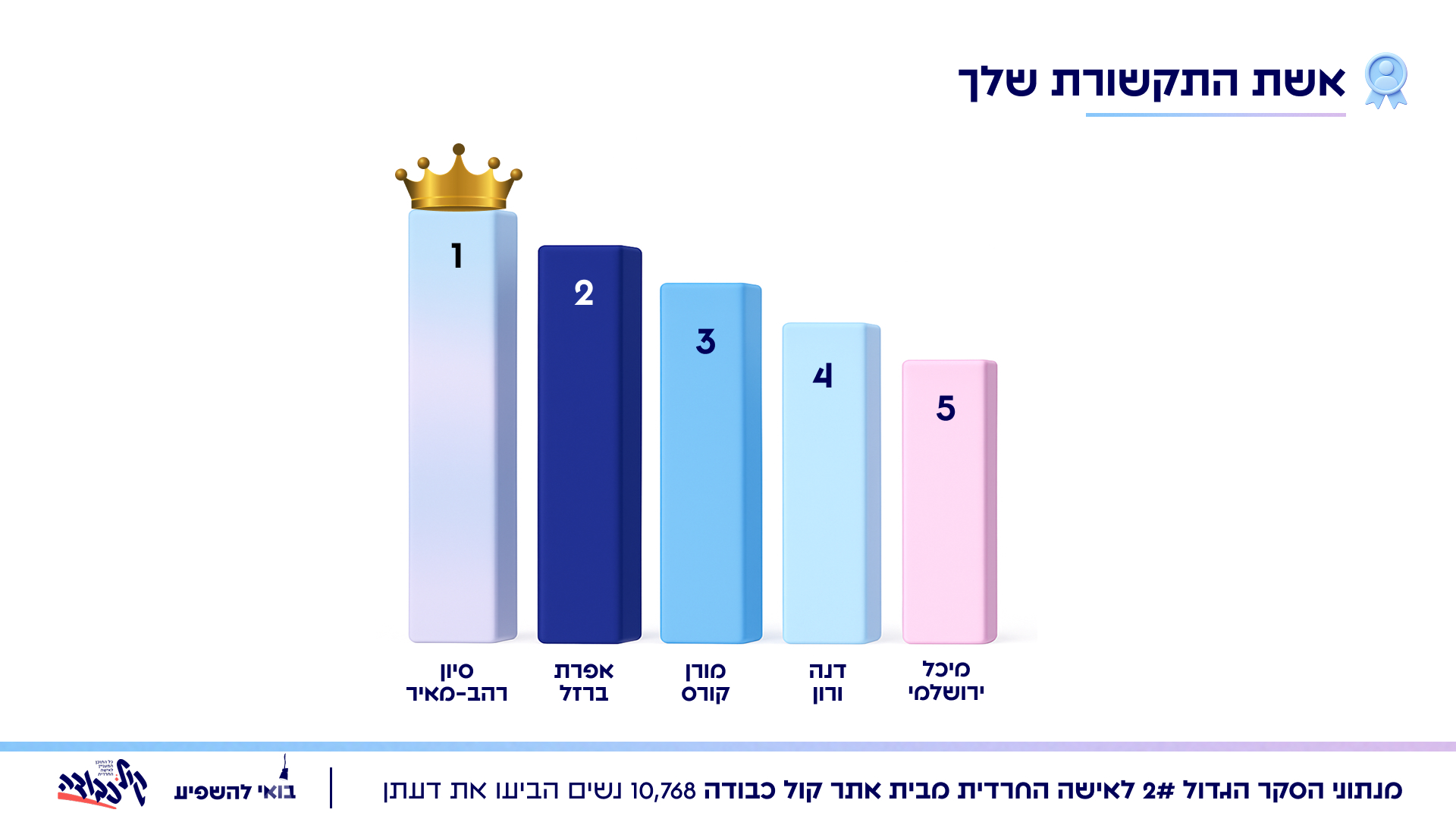 דנה ורון אשת התקשורת שמובילה במאמרים פובלציסטים ברשתות החברתיות נבחרה למקום הרביעי באחוז ההצבעות, ולאחריה מיכל ירושלמי המיוחדת שמגישה תוכנית פופולארית ברדיו קול חי ומנהלת בית ספר לאומנות הדיבור לאישה החרדית.